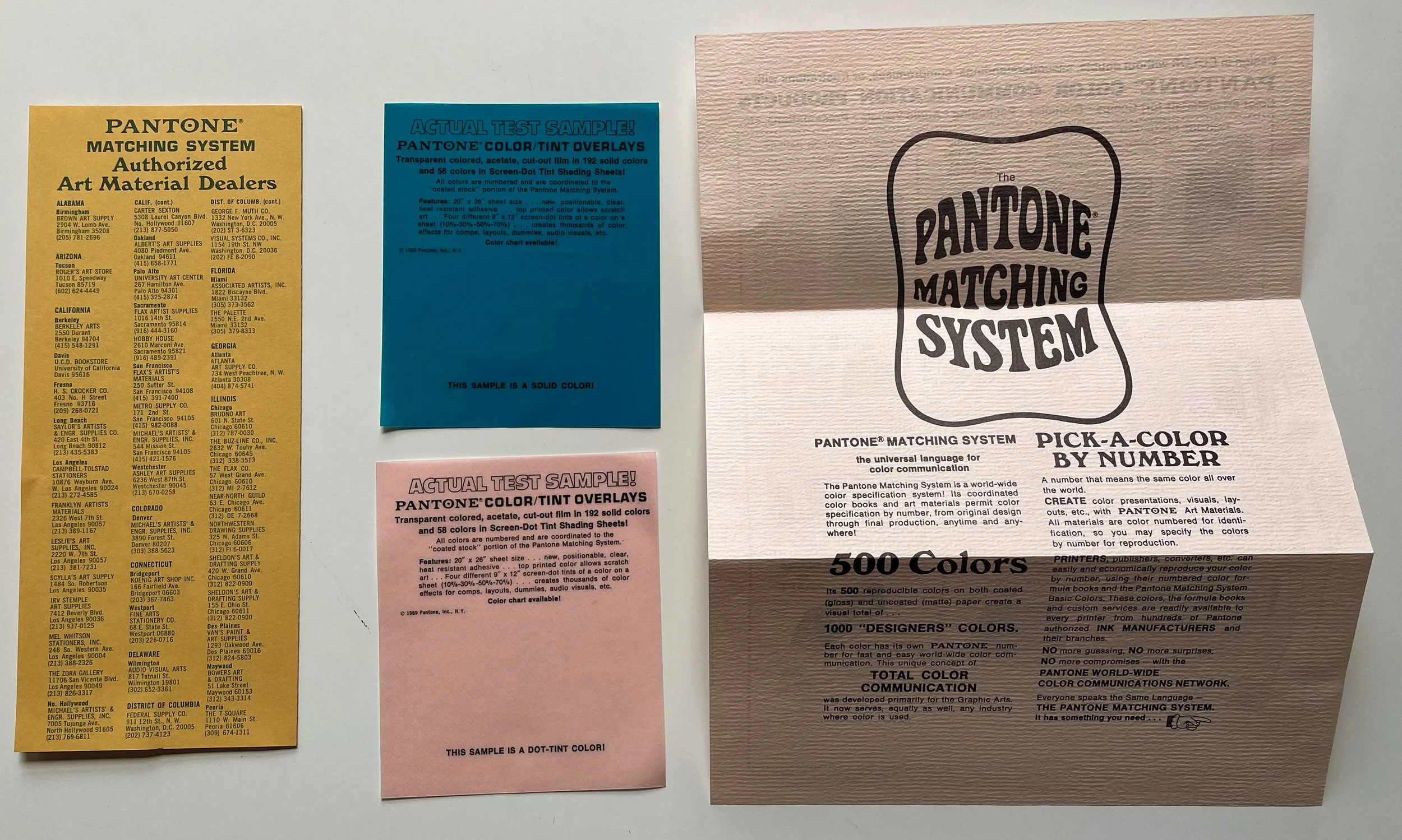 Pantone color sample kit in its original psychedelic-design mailing envelope with the pitch “Take Me! Take Me! I Am Your Pantone Color Sample Kit…” Published by Pantone in 1969. The kit contains the following items: an accordion fold-out color chart; an accordion fold-out chart of color/tint overlays; two actual test samples of the color/tint overlays measuring 3.75” x 4.5”; a double-sided page advertising the Pantone Matching System; and a fold-out listing authorized dealers of the Pantone Matching System. The envelope measures 6.” x 9.5”. Some bumping and rubbing to the envelope; contents clean and bright.